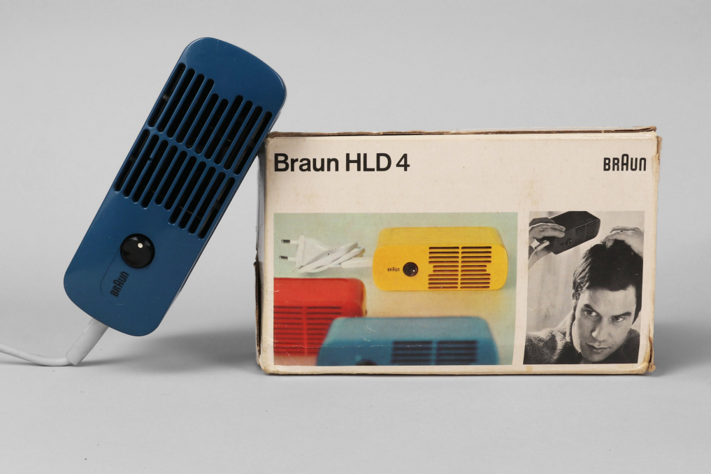 Beautiful design classic hair dryer HLD 4 in blue color. Designed by legendary Dieter Rams in 1970s. The foundation for the design was an new reconstructed version of the fan based on the HLD2 fan by Reinhold Weiss in 1963. The housing is made of orange plastic a minimal black switch on the front. The white cable wire is original and comes with an EU plug (220V). A must-have for every Braun collector. Excellent original condition including original box with only very few almost invisible signs of use. Functionality: operational. Mainly intended for decoration purposes.