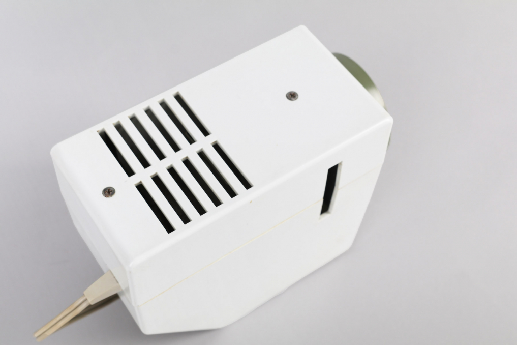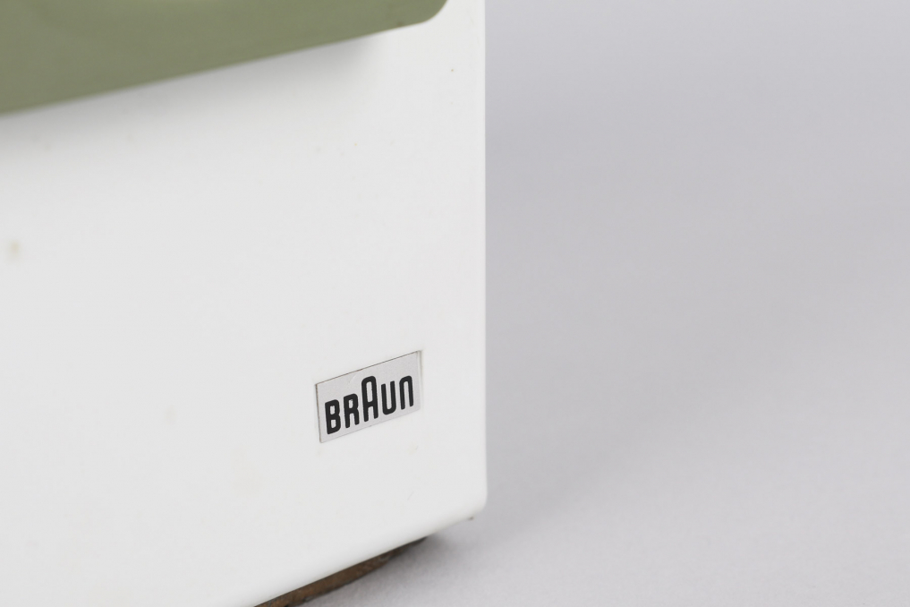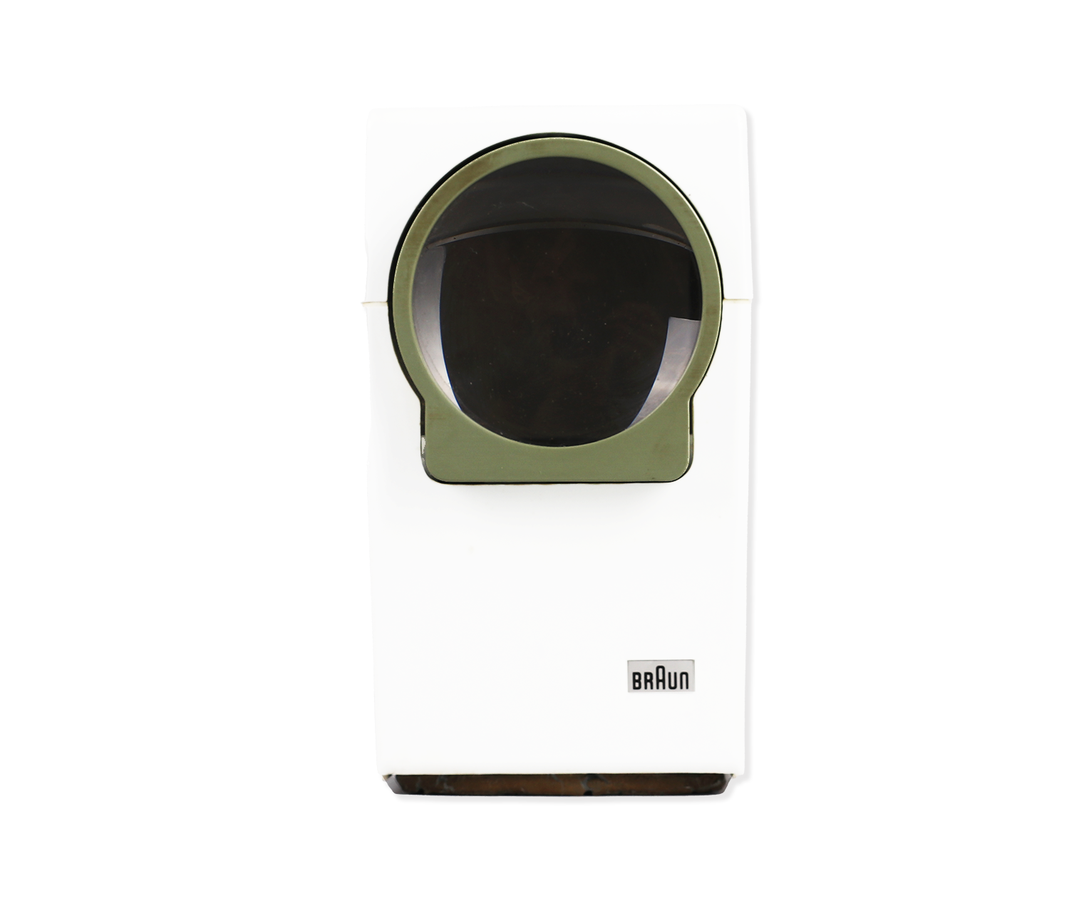 Designed by Dieter Rams at 30 for BRAUN in Kronberg, the Typ D5 Combiscope is a compact slide projector with a second, simple function: its pull-out lens focuses light to create room reflections, even illuminating higher areas thanks to its beveled housing. Matte light-gray melamine, an integrated cooling fan, and meticulous detailing — down to the custom Braun typeface — reflect the radical, reduced design philosophy of the era. Please note that this items is not functional and purely for collectors and for display purposes only. It comes with a cut cable (from the previous owner) and is missing the Dia slider. It is yet a beautiful product design collectible designed by Dieter Rams for your shelve.