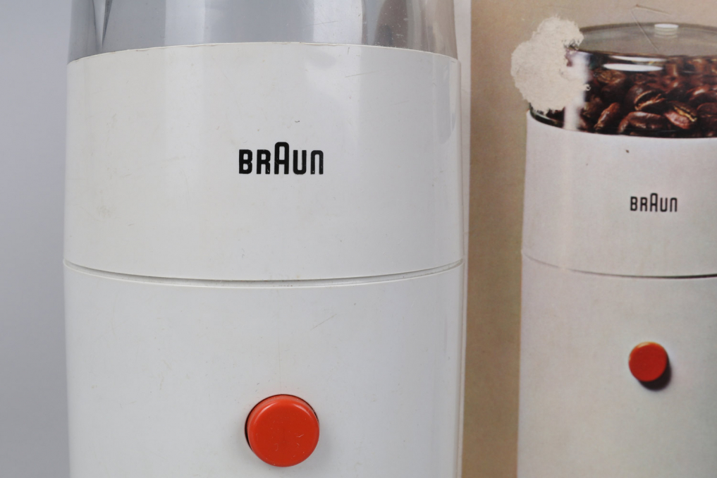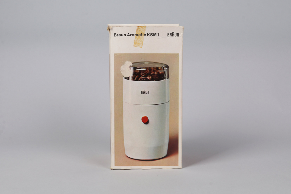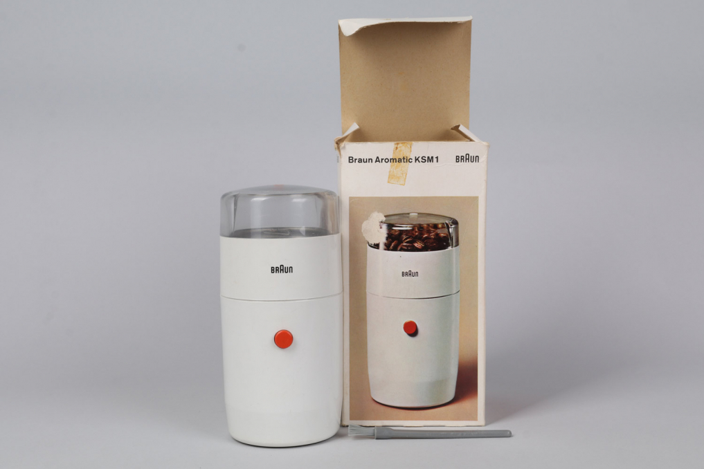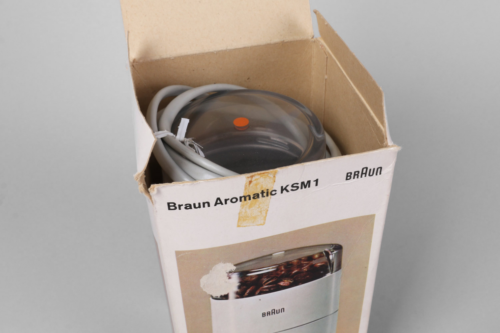 Iconic BRAUN KSM 1/11 Coffee Grinder designed by Reinhold Weiss in 1963 in white color. An absolute classic that should be part of every Braun collection. This particular piece is very rare as it comes with the original packaging including manual and a cleaning brush. The grinder is in excellent as good as new condition and operational. It can be operated on 220V and is equipped with a DE plug.