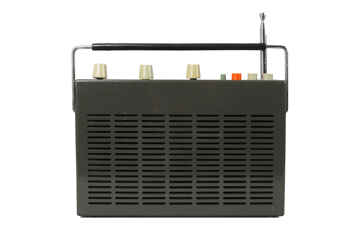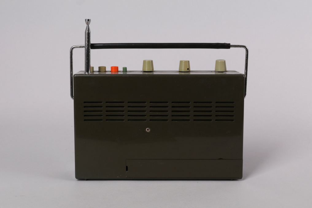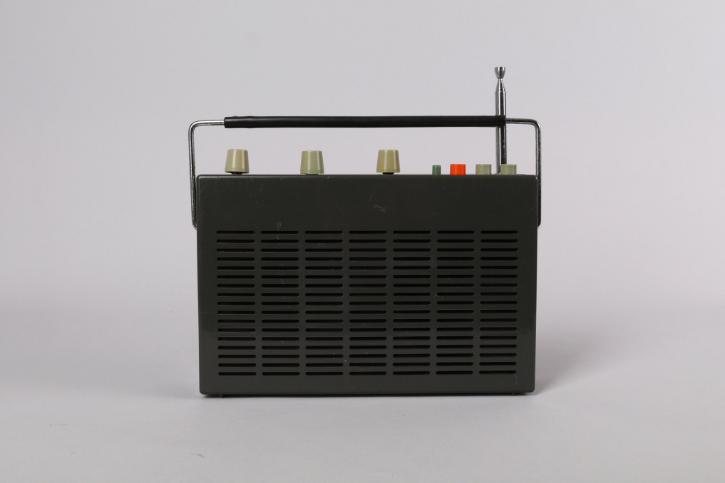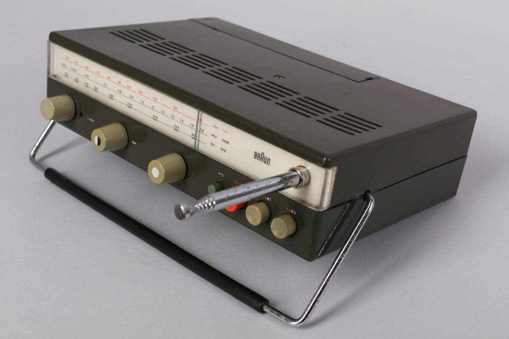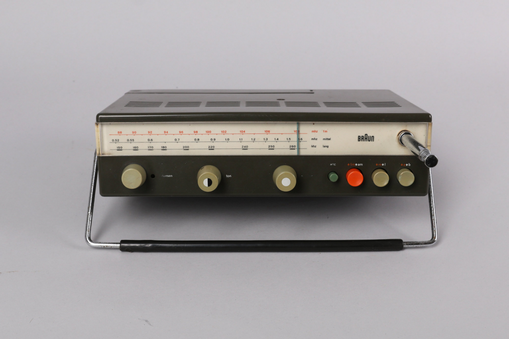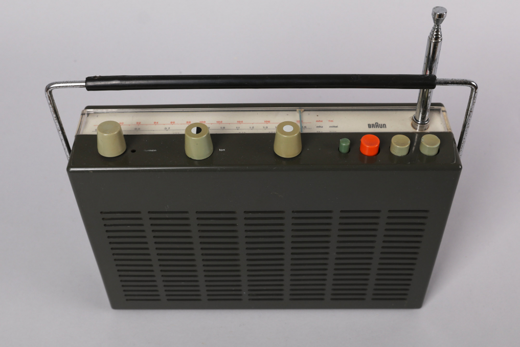 Beautiful design classic Braun T 580 radio designed in Germany by Dieter Rams (1962–1964). The rare and iconic transistor is made of dark graphite plastic (rare!) and has an adjustable metal handle. The antenna can be pulled out and is adjustable - however it can not be pulled into radio unit fully. The radio is in a good outer condition with minor scratches but no broken pieces. Currently it is missing a spring in the battery department and thus it has not been tested to full extent! Sold as an iconic collectible item.