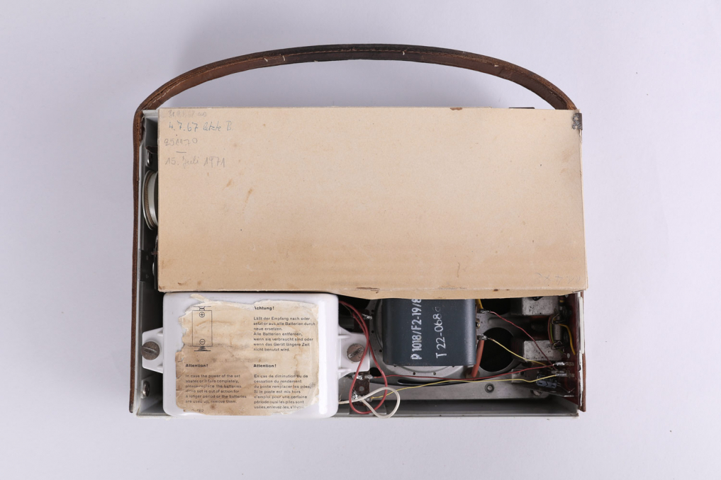 Beautiful and very rare design classic radio “Kofferempfänger“ by Braun - Type T22 / T 22. Designed in Germany by Dieter Rams in 1957. The iconic & timeless radio is made of light-grey plastic and is held by a brown leather belt. Beautiful original working condition with small cracks on plastic (see images). The antenna can be pull out of the radio with adjustable size and possibility to rotate (last part has been reclaimed and glued together).