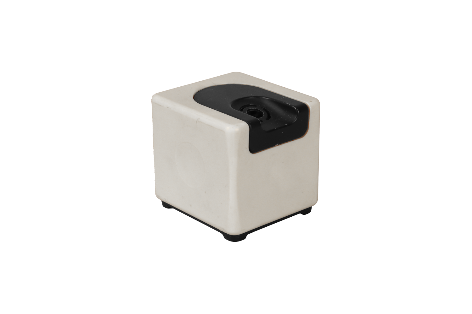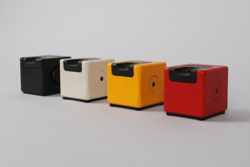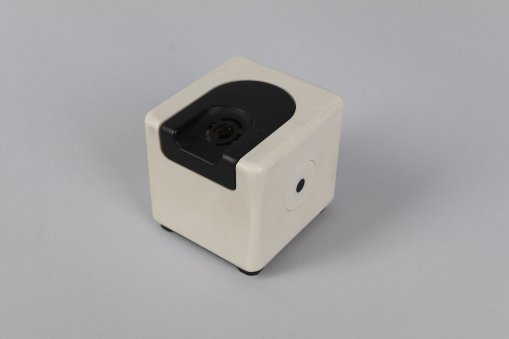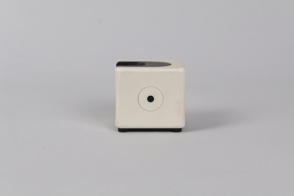 White cubic Braun T4 domino table lighter designer by Dieter Rams in 1970 made of plastic with a metallic top. This particular model has a button on the side, with an electric trigger and can be refilled with gas on the bottom. This is where you also find the control of the flame intensity and batter compartment. The overall condition is good, the function is not proven. Please note we are selling the lighter as a collectible item.