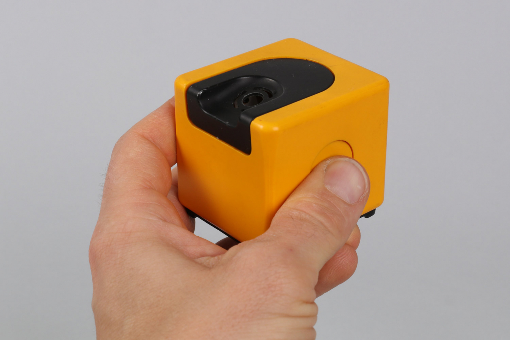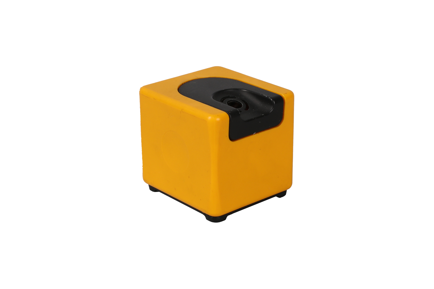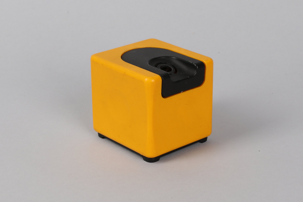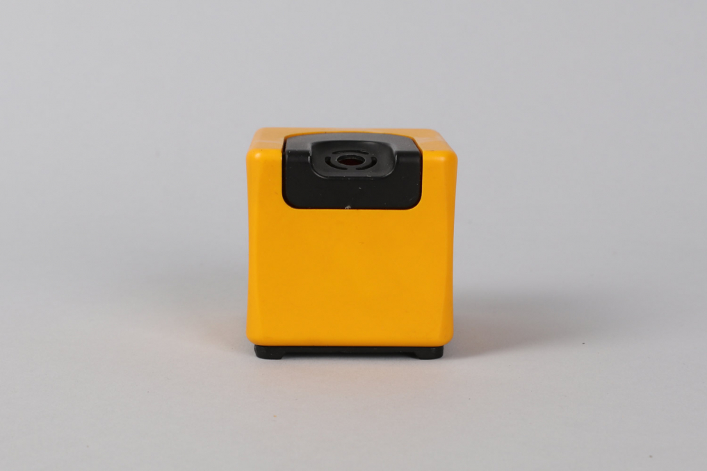 Yellow cubic Braun T4 domino table lighter designer by Dieter Rams in 1970 made of plastic with a metallic top. This particular model has a button on the side, with an electric trigger and can be refilled with gas on the bottom. This is where you also find the control of the flame intensity and batter compartment. The overall condition is good, the function is not proven. Please note we are selling the lighter as a collectible item.