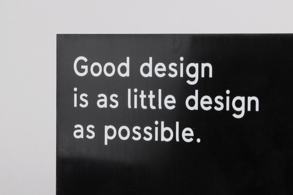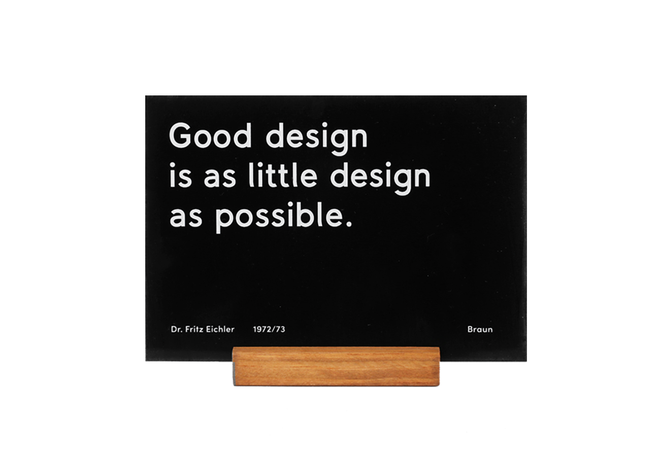 This Braun inspired desk display with the famous "Good design is as little design as possible" quote is printed in white on a black Acrylic and comes with a wooden base. Exclusively designed & produced by Only / Once. The display stand is a perfect addition to any Braun product collection. *NOTE: If you are more flexible on your delivery time, we can ship it for a cheaper rate - Please reach out via email info@onlyonceshop.com*